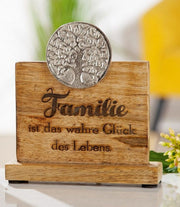 Edler Lebensbaum Aufsteller, Mango-Holz und brüniertes Aluminium, Modell: FAMILIE IST DAS WAHRE GLÜCK DES LEBENS, Maße 16 x 15 x 5 cm, Farbe Natur und silber, tolle Deko