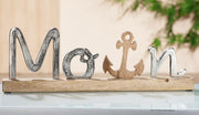 Großer edler maritimer Schriftzug auf Mango-Holz in brüniertem Aluminium als Aufsteller, Modell: MOIN , Maße 43 x 14 x 5 cm, Farbe Natur und Aluminium, tolle Deko fürs Cafe oder Zuhause