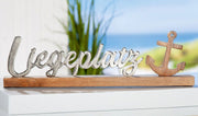 Grosser maritimer Alu- Holzschriftzug als Aufsteller, Modell: LIEGEPLATZ, Material Alu und Holz, Maße 51 x 15 cm, Farbe silber, ideal für Garten, Terrasse, Cafe, Cafeteria, hoher Neidfaktor