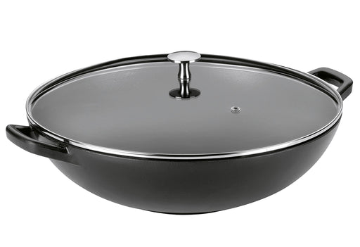 Inhalt: 1 x Wok aus Gusseisen, für alle Herdarten geeignet inkl. Induktion, Deckel aus Metall, Dünstrost aus Edelstahl, 1 x Paar Stäbchen, Holzzang...
