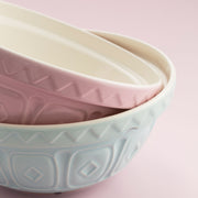 Die farbigen Rührschüsseln von Mason Cash besitzen einen ganz individuellen Charme, ob als Obstschale, Salatschüssel oder als Rührteigschüssel für das Zubereiten von Brot-, Kuchen-, Gebäck- und Pizzateig Kreationen, diese Schüssel verleiht Ihrer Küche einen freundlichen Farbtupfer. Das Design der Schale hat sich bewährt und wurde im Test der Zeit zum Designklassiker. Die Mason Cash Rührschüsseln werden aus hochwertigem, splitterresistentem Steingut hergestellt. Daher sind sie schwer genug um beim Mischen zu sicher zu stehen und gleichzeitig leicht genug, um komfortabel im Arm gehalten zu werden. Gleichzeitig ist der Rand der Rührschüssel ideal zum Greifen und zum Kippen. Die breite, flache Form ermöglicht bei Bedarf auch das Kneten innerhalb der Schüssel. Dank dieser positiven Eigenschaften ist die Mason Cash Rührschüssel zum Synonym für die Marke und fürs Backen überhaupt geworden. Das markant gemusterte Äußere und die 4 ansprechenden Farbtöne rot, cremeweiß, hellblau und pastellrosa machen diese Rührschüssel zum absoluten Hingucker. Die Rührschüssel ist in drei verschiedenen Größen 4 Liter, 2,7 Liter, 2 Liter erhältlich.