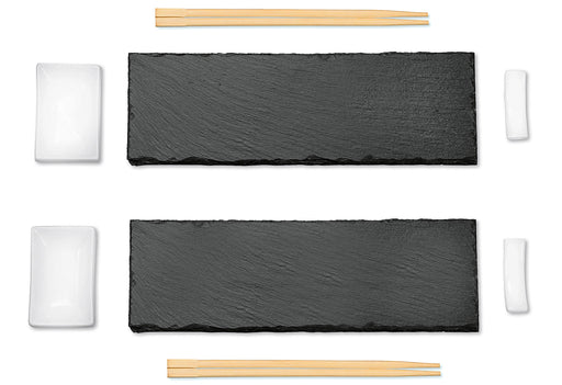 Inhalt: 2 Schieferplatten Maße: 30 x 10 cm, 2 Dipschalen, 2 Sushi-Stäbchenhalter und 2 Paar Sushi-Essstäbchen·Schieferoptik