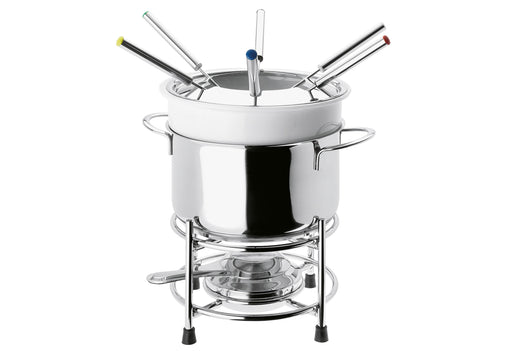 Porzellan / Edelstahl, Inhalt: 1 x Fonduetopf Edelstahl, 1 x Fonduetopf Porzellan, 1 x Spritzschutz, 6 x Fonduegabeln, 1 x Rechaud, 1 x Pastenbrenn...