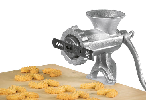 View full detailsGrauguss verzinnt, Inhalt: Fleischwolf, 3 Lochscheiben in den Größen 5 - 6 - 8 mm und Spritzgebäck-Vorsatz, problemlos von Hand zu reinigen· (LxBx...