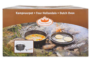 Gusseisen / Metall / Eschenholz, mit 3 Füßen, inklusive Deckelheber, ein Dutch Oven ist ein traditioneller, dickwandiger Kochtopf aus Gusseisen, der seit vielen Jahrhunderten verwendet wird, dank des Materials wird die Wärme gleichmäßig über den gesamten Topf verteilt und erwärmt so die Speisen von allen Seiten, Kohle oder Briketts können zusätzlich noch auf dem Deckel platziert werden, um so noch extra Wärme von oben zu erzeugen, durch das Umdrehen des Deckels kann dieser auch als zweite Pfanne verwendet werden, in der umgedrehten Version verfügt der Deckel über einen geriffelten Boden, dank der drei Füße steht der Dutch Oven sicher in und über dem Feuer, alternativ kann er auch an den zwei Henkeln über das Feuer gehängt werden, die jeweils eine Kerbe für einen Haken haben, mit dem mitgelieferten Deckelheber, lässt sich der heiße Deckel problemlos anheben