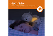 Polyester / ABS, kuscheliges Nachtlicht-Stofftier, 2 Helligkeitsstufen, mit Schlafliedern, Lounge-Musik und Naturgeräuschen in zwei unterschiedlichen Lautstärken, Licht und Musik schalten sich automatisch nach 20 Minuten aus, benötigt 3 AAA Batterien (nicht enthalten), bei aktiviertem Geräuschsensor schaltet sich das Licht wieder ein, wenn das Baby weint, für Kinder ab der Geburt·grau/weiß (LxBxH): 13x13x45 cm