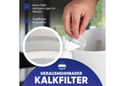 Füllmenge bis zu 1,7 Liter, Einfache Handhabung durch kabellose Technik, Sicherheitsklappdeckel mit Einhandbedienung, Kalkfilter (herausnehmbar), Ein-/Ausschalter (beleuchtet), Edelstahlheizelement, Automatische und manuelle Abschaltung, 2 außenliegende Wasserstandsanzeigen, Rutschfester Soft Touch-Griff, Basisstation mit Kabelaufwicklung, Trockengeh-/Überhitzungsschutz, 220–240 V, 50 Hz, 1850–2200 W, Schukostecker CEE 7/7·weiß