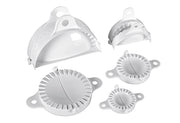 Kunststoff (Polypropylen), 5 Größen (Ø 17,5, 12, 10, 8,5 und 6 cm) für allerlei Teigwaren-Spezialitäten wie Ravioli, Maultaschen, Suppeneinlagen etc., mit großer Form für Pizza Calzone· Ø 6 - 17,5 cm