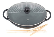 Aluguss, Inhalt: 1 x Wok, 1 x Tempara-Rost, 1 x Glasdeckel, 1 x Holzzange, 1 Paar Chopsticks, Bodenstärke ca. 5 mm, Materialstärke ca. 2,2 mm, mit Beschichtung, für alle Herdarten geeignet, nicht Induktionsgeeignet, im Karton· Ø 36 cm