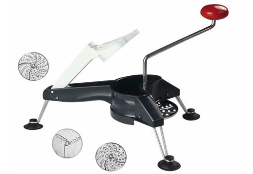 ABS / Edelstahlklinge, mit 5 Einsätzen: grobe und feine Gemüsereibe, Kartoffelreibe, verstellbarem Schneidmesser für unterschiedlich dicke Scheiben...