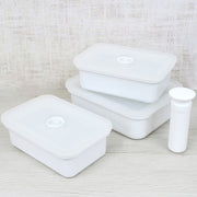 Lebensmittel länger frisch aufbewahren – die Vakuum Frischhaltedosen aus Emaille machen es möglich. Über den innovativen Deckel mit Vakuumventil kann der Dose mittels einer Vakuumpumpe die Luft (Sauerstoff) entzogen werden – dadurch verlängert sich die Haltbarkeit der Lebensmittel. Wurst, Käse, Obst und Gemüse bleiben länger frisch und das Aroma von beispielsweise Kräutern, Tee und Kaffee bleibt wesentlich länger erhalten. Das Vakuum schützt die Lebensmittel vor Oxidation, minimiert die Feuchtigkeit und schützt die Lebensmittel vor Bakterien- und Pilzbefall.