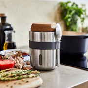 Der vakuumisolierte Lunchbecher Food Flask von black+blum hält die Lebensmittel bis zu 6 Stunden warm und für bis zu 8 Stunden kalt. Er ist ideal für die Mitnahme von heißen Speisen wie Pasta, Risotto oder auch Suppe - denn der Thermobecher ist absolut auslaufsicher. Das kompakte Design und die große Öffnung sind besonders praktisch für die Mitnahme, sowie auch für den komfortablen Verzehr von Mahlzeiten. Der Deckel ist aus Naturkork zur idealen Isolierung der großen Öffnung. Der beiliegende Löffel ist aus Edelstahl.