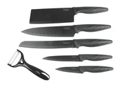 Edelstahl rostfrei, keramische Beschichtung, Inhalt: 1 x Fleischermesser Klingenlänge 15 cm, 1 x Kochmesser Klingenlänge 21 cm, 1 x Brotmesser Klingenlänge 21 cm, 1 x Gemüsemesser Klingenlänge 12 cm, 1 x Kräutermesser Klingenlänge 9 cm, 1 x Schäler , Box mit Magnetverschluss·schwarz
