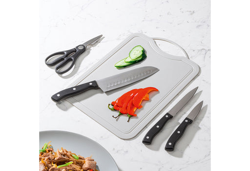 Edelstahl / Kunststoff, Inhalt: 1x Schneidbrett aus Kunststoff, Maße: (LxBxH): 35,7x25,2x0,45 cm und jeweils 1 x Chefmesser L 18 cm, Allzweckmesser...