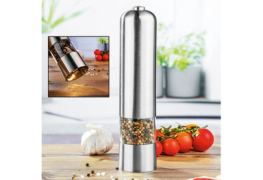 Edelstahl rostfrei / Sichtfenster aus Acryglas, Keramikmahlwerk, batteriebetrieben (Batterien nicht enthalten), mit Lichtfunktion· Ø 5 cm, H 22,5 cm