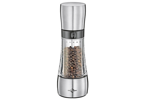 Edelstahl / Acryl, mit Mahlwerk aus Hochleistungskeramik, ungefüllt, zum Befüllen der Mühle Oberteil nach oben abziehen, mit 5–stufiger Mahlgradein...