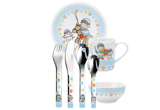 Edelstahl 18/10 / Porzellan, Inhalt: 1 x Gabel, 1 x Messer 1 x Löffel, 1 x kleiner Löffel, 1 x Teller, 1 x Tasse, 1 x Schale, spülmaschinengeeignet
