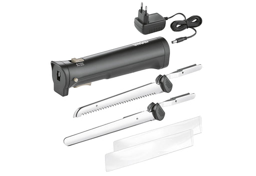 View full detailskabelloses Elektromesser mit zwei austauschbaren Edelstahl-Messern (ein Messer mit gezahnter Doppelklinge und ein Glattes), Sicherheitsschalter: 2 ...