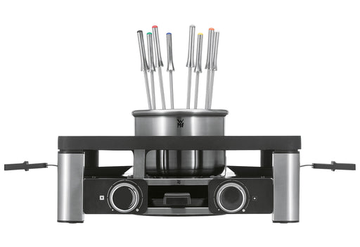 Drei Geräte in einem: Tischgrill, Raclette und Fondue mit Zubehör für bis zu acht Personen, Cromargan®-Gehäuse mit WMF Lumero LED-Beleuchtung für s...