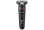 Der Rotationsrasierer MN8X sorgt für glatte Haut dank 360°-Flex-Rasierkopf. Die drei Scherköpfe passen sich optimal den Gesichtskonturen an und ermöglichen eine gründliche und sanfte Rasur. Durch die Magnetfixierung ist der Scherkopf ganz leicht abnehmbar. Ein Präzisionstrimmeraufsatz macht selbst präzise "Feinarbeiten" am Bart möglich. Das Gerät ist wasserdicht (IPX7) und kann auch in Dusche oder Badewanne benutzt werden. Es verfügt ebenfalls über eine Reisesicherung. Der leistungsstarke Lithium-Ionen Akku sorgt für 60 Minuten Rasierzeit bei 90 Minuten Ladezeit. Besonders praktisch ist die Schnellladefunktion, wodurch der MN8X bei nur fünf Minuten Ladezeit zehn Minuten betrieben werden kann. Auf dem LED-Display werden Lade-, Akku-, Reisesicherungs- und Wartungssymbole angezeigt. Im Lieferumfang sind Lade- und Aufbewahrungsstation, Schutzkappe, Reinigungspinsel und USB-C-Ladekabel mit Adapter enthalten.