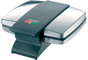 Muschelform, für 2 ganze Toastscheiben, fettarmes Backen durch Antihaftbeschichtung, optische Fertigmeldung durch Backampel, fest eingestellter Bräunungsgrad, 3-stufige Griffverriegelung, platzsparende, auf den Griffen stehende Aufbewahrung, Kabelaufwicklung mit Steckerdepot, Edelstahlgehäuse, Temperaturkontrollleuchte, Betriebskontrollanzeige, 930 Watt, Schukostecker CEE 7/7·schwarz/silber