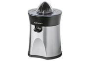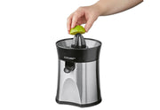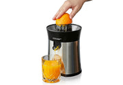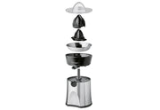 2-in-1 Zitruspresse, Für kleine Orangen, Zitronen und Limetten, oder große Orangen und Grapefruits, mit kleinem und großem Presskegel, Motor startet bei Druck auf den Presskegel, Automatische Abschaltung, Ausgießer mit Tropf-Stopp Funktion, Edelstahl Siebeinsatz, Einsatz, Deckel und Presskegel spülmaschinengeeignet, Für Behälter oder Gläser bis 13,5 cm Höhe, Transparenter Deckel als Staubschutz, Kabelaufwicklung, Rutschfeste Gummifüße, Gebürstetes Edelstahlgehäuse