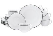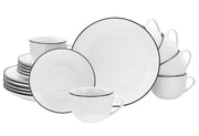 Porzellan, für 6 Personen, spülmaschinen- und mikrowellengeeignet, Inhalt: 6x Frühstücksteller Ø 20 cm, 6x Kaffeetasse 200 ml, 6x Kaffeeuntertasse Ø 14 cm, Serie LUNA: Topaktuelle und trendige Coupeform·weiß mit schwarzem Linienrand