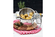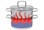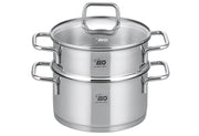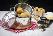 Edelstahl 18/10, Wandstärke ca. 0,6 mm, Bodenstärke ca. 4,1 mm, energiesparender Kapselboden, innen satiniert mit Volumenskala, außen hochglanzpoliert mit Logo, Edelstahl Drahtgriffe geschweißt, Glasdeckel mit stoßfestem EDS Ring und weißem Logo, EDS Bügelgriff mit Fingerschutzplatte, optimal für wasserarmes, vitaminschonendes Garen, spülmaschinengeeignet, backofenfest bis 240 °C (mit Glasdeckel 180 °C), für alle Herdarten geeignet Ø 18 cm, Topf 2 l, Dünstaufsatz 1,6 l