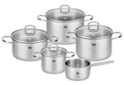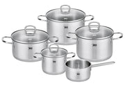 Edelstahl, Inhalt: 1 x Bratentopf m. D. Ø 20 cm, 1 x Fleischtopf m. D. Ø 16 cm, 1 x Fleischtopf m. D. Ø 20 cm, 1 x Fleischtopf m. D. Ø 24 cm, 1 x Stielkasserolle o.D. Ø 16 cm, flache, geschweißte Edelstahl-Drahtgriffe, Glasdeckel mit stoßfestem Edelstahlrand, EDS Bügelgriff mit Fingerschutzplatte, energiesparender Kapselboden, Wandstärke ca. 0,6 mm, Bodenstärke ca. 4,6 mm, innen satiniert mit Literskala und Öl-Dosiersystem, für alle Herdarten geeignet, optimal für wasserarmes, vitaminschonendes Garen, spülmaschinengeeignet, backofenfest bis 240 °C ohne Deckel (mit Glasdeckel 180 °C)