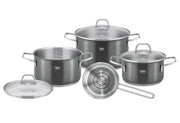 Edelstahl 18/10, Inhalt: 1 x Fleischtopf mit Glasdeckel Ø 16 cm, 1,7 l, 1 x Fleischtopf mit Glasdeckel Ø 20 cm, 3,3 l, 1 x Fleischtopf mit Glasdeckel Ø 24 cm, 5,7 l, Stielkasserolle mit Ausguss Ø 16 cm, 1,3 l, mit energiesparendem Kapselboden, innen satiniert mit Literskala und Öl-Dosiersystem, Topfkörper außen mit schwarzer, transparenter PVD Oberflächenveredelung, Topfboden satiniert, kratz- und verschleißfest, hitzebeständig, Edelstahl Drahtgriffe, geschweißt, Glasdeckel mit stoßfestem EDS-Ring, EDS-Bügelgriff mit Fingerschutzplatte, spülmaschinengeeignet, backofenfest bis 240 °C ohne Deckel (mit Glasdeckel 180 °C), für alle Herdarten geeignet inkl. Induktion·grau