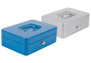 Stahl lackiert, mit Henkel, 2 Schlüsseln und praktischem Einsatz zum einfachen, übersichtlichen Verstauen von Münzgeld·grau, blau (LxBxH). 25x9x18 cm