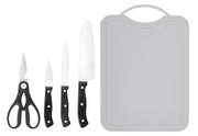 Edelstahl / Kunststoff, Inhalt: 1x Schneidbrett aus Kunststoff, Maße: (LxBxH): 35,7x25,2x0,45 cm und jeweils 1 x Chefmesser L 18 cm, Allzweckmesser L 13 cm, Gemüsemesser L 9 cm, Küchenschere L 20,9 cm