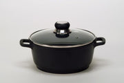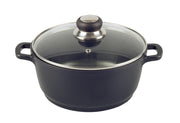 Aluguss, Bodenstärke 5 mm, Wandstärke 2,2 mm, antihaftversiegelt, mit Glasdeckel, schwere Qualitätsausführung, mit Edelstahlschutzrand und Lüftungsloch, Kunststoffknopf bis 180°C hitzebeständig, für alle Herdarten inkl. Induktion geeignet, jeder Artikel im Buntkarton verpackt 2,1 l, Ø 20 cm