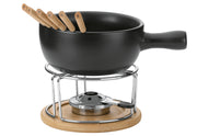 Keramik / Edelstahl / Buchenholz, Inhalt: 1 Fonduepfanne Ø 20 cm, 1 Rechaud, 6 Gabeln, 1 Untersetzer, 1 Sicherheitspastenbrenner, Gabelköpfe mit einzelnen Buchstaben von "F O N D U E" markiert, Sicherheitspastenbrenner nur mit Brennpaste befüllen·schwarz 2 l, Ø 22,5 cm, (LxH): 32x19 cm