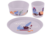 bio-zirkuläres Material + Holz, Inhalt: 1 x Becher 190 ml, 1 x Schale 400 ml, 1 x Teller Ø 20,5 cm, robust, leicht und stapelbar, lebensmittelecht, mikrowellengeeignet max. 360 W / max. 100°C, 100% recycelbar, 100% CO2-neutral, 100% reines Material, melaminfrei, spülmaschinengeeignet··organic grey