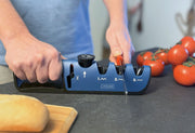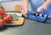 Kunststoff (ABS) / Wolframstahl, 3 in 1: schärft, schleift, poliert Messer in 3 Sek., mit drei innovativen Schleifschlitzen, perfekt für viele unterschiedliche Messertypen und dank eingebauten Scherenschleifers auch ideal zum Schärfen von stumpfen Scheren, über die praktische Stellschraube kann die Neigung der Schleifbakken ganz einfach auf jedes Messer eingestellt werden, kinderleichte Bedienung: einfach durchziehen ohne Kraftaufwand·blau