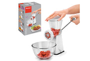 Kunststoff, Inhalt: 2 x Einsätze zum Zerkleinern von Fleisch, Nüssen und Gemüse, 1 x Gebäckeinsatz für Spritzgebäck, Kekse und Nudeln, großer Saugfuß für festen Stand, Sicherheitsriegel zur Befestigung auf glatten Oberflächen für einfaches und sicheres Arbeiten. Für Kinder unzugänglich aufbewahren. Vor Gebrauch spülen.·weiß
