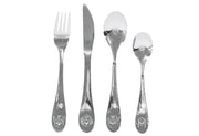 18/10 Edelstahl rostfrei, Inhalt: Messer, Gabel, Suppenlöffel, Dessertlöffel, angesagtes Paw Patrol Motiv, Messer L ca. 18,5 cm: Prägung "Chase", Gabel L ca. 17,5 cm: Prägung "Marshall", Suppenlöffel L ca. 17,5 cm: Prägung "Rubble", Kleiner Dessertlöffel L ca. 14,5 cm: Prägung "Skye", spülmaschinengeeignet, nicht mikrowellengeeignet, im Geschenkkarton Karton (LxBxH): 3x14x20,5 cm