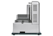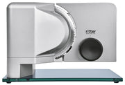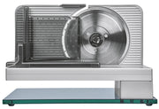 Metallausführung, freitragend, Bodenplatte aus bruchfestem Sicherheitsglas, Wellenschliffmesser - 17 cm ?, Schnittstärkeeinstellung bis ca. 20 mm, Sicherheits-Moment- und Dauerschalter, Abnehmbarer Schlitten, Schlittenweg ca. 18 cm, Kabeldepot, Leistung 65 Watt, KB 5 min.·silbermetallic (BxHxT): 20,5x24x34,5 cm