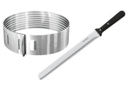 Edelstahl, Inhalt: 1 x Schneidhilfe mit Führungsschienen in sieben verschiedenen Höhen, einfach auf einer Seite einschneiden, um 180 Grad drehen, Vorgang wiederholen und schon sind die perfekt gleichmässigen Tortenböden fertig, variabel Ø 26-28 cm, 1 x Kuchen- und Glasurmesser, die ideale Ergänzung zur Tortenbodenschneidhilfe, Klingenlänge 30 cm, geeignet zum Schneiden, aber auch zum Glasieren von Torten und Kuchen, beidseitiger Schliff der Klinge, beide Teile sind spülmaschinengeeignet