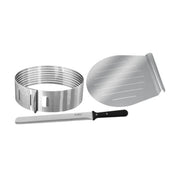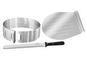 Edelstahl, Inhalt: 1 x Schneidhilfe mit Führungsschienen in sieben verschiedenen Höhen, einfach auf einer Seite einschneiden, um 180 Grad drehen, Vorgang wiederholen und schon sind die perfekt gleichmässigen Tortenböden fertig, variabel Ø 26-28 cm, 1 x Kuchen- und Glasurmesser, die ideale Ergänzung zur Tortenbodenschneidhilfe, Klingenlänge 30 cm, geeignet zum Schneiden, aber auch zum Glasieren von Torten und Kuchen, beidseitiger Schliff der Klinge, 1 xKuchenretter dünne Edelstahlplatte zum einfachen Lösen und Abheben von Kuchen, praktische Griffmulde, Größe von 27 x 28 cm ist auch für große Torten, spezielle Rippen verhindern Ankleben, auch als Schneidunterlage verwendbar, alleTeile sind spülmaschinengeeignet