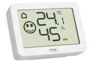 Kunststoff, kleines Thermo-Hygrometer, Höchst- und Tiefstwerte werden gespeichert und auf Knopfdruck angezeigt, mit zwei kleinen Magneten auf der Rückseite haftet das Thermo-Hygrometer an Metallflächen, ausklappbarer Ständer, mit Klima-Komfort-Anzeige: Ein lachendes Smiley zeigt an, wenn die Klimabedingungen optimal sind. Ein neutrales oder trauriges Gesicht weist auf mäßige bzw. schlechte Bedingungen hin, Sie können zwischen vier verschiedenen Einsatzgebieten für das Thermo-Hygrometer wählen: Raumklima, Musikinstrumente, Schildkröte und Humidor: Raumklima: Raumtemperatur von 19 – 25 °C und eine relative Luftfeuchtigkeit von 40 – 60 % - Musikinstrumente: 18 – 24°C und 45 – 55% relative Luftfeuchtigkeit - Schildkröte: 25 – 32 °C und 45 – 65 % relative Luftfeuchtigkeit - Humidor: 65 – 75 % relativer Luftfeuchtigkeit und 18 – 22 °C·weiß (BxHxT): 5,5x4x1,5 cm