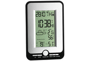 Kunststoff, Inhalt: Basisstation und Thermo-Hygro-Sender, Messbereich: außen –40 °C bis +70 °C, innen –9 °C bis +70 °C, 20 % bis 95 % rF, kabellose Übertragung der Außentemperatur, Anzeige von Innentemperatur und Luftfeuchtigkeit, Max.-Min. Funktion, Wettervorhersage, Wettertendenz, Funkuhr mit Datum, Wochentag, Alarm und Snooze Funktion, Hintergrundbeleuchtung, T-Sender benötigt wird 1 x 1,5 V AAA Batterie (nicht inklusive), Basisstation zum Stellen und Hängen, benötigt wird 2 x 1,5 V AAA Baterien (nicht inklusive)·silberfarben / schwarz (LxBxH): 11,8x2,9x18 cm