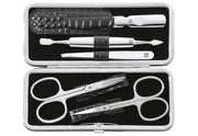 im Echtleder-Etui in Kroko Optik, mit Metallrahmen, enthält hochwertige Instrumente zur Pflege der Finger- und Fußnägel: 1 Nagelschere mit leicht gebogener Schneide, 1 Saphir-Nagelfeile L 13 cm, 1 Nagelhautschere, 1 Nagelhautschieber L 13 cm, 1 Pinzette mit schräger Spitze·schwarz