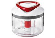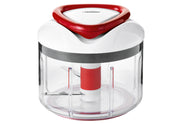 Kunststoff / Edelstahl, stabiler Handgriff am Seilzug, Klinge im patentierten Swiss-Design - schneidet sogar die härtesten Zutaten, Verstärkungshalterung für gleichmäßiges Zerkleinern, für grobes Zerkleinern drei bis fünfmal ziehen, für feineres Zerkleinern acht bis zehnmal, spülmaschinenfest·weiß / rot 750 ml, Ø 14 cm, H 13,2 cm, 383 g·Fachhandel exklusiv·
