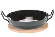 emailliert, Inalt: 1 x Schlemmerpfanne mit zwei Henkeln, 1 x Holzbrett als Untersetzer·schwarz / naturfarben Ø 20 cm