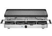 Alugrillplatte, ganz im Edelstahl-Look präsentiert sich Raclette 8 inox, das Gehäuse ist aus satiniertem Edelstahl, die antihaftbeschichtete Grillplatte kann auf beiden Seiten verwendet werden, zum Grillen von Fleisch, Fisch oder Gemüse und für die Zubereitung von Crepes, mit Temperaturregler, im Lieferumfang enthalten: 8 Pfännchen, 8 Spachtel, integriertes Elektrokabel, Gebrauchsanweisung, 1200 Watt, Schukostecker CEE 7/7·Fachhandel exklusiv