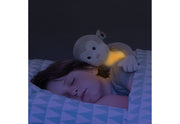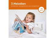 Polyester / ABS, kuscheliges Nachtlicht-Stofftier, 2 Helligkeitsstufen, mit Schlafliedern, Lounge-Musik und Naturgeräuschen in zwei unterschiedlichen Lautstärken, Licht und Musik schalten sich automatisch nach 20 Minuten aus, benötigt 3 AAA Batterien (nicht enthalten), bei aktiviertem Geräuschsensor schaltet sich das Licht wieder ein, wenn das Baby weint, für Kinder ab der Geburt·grau/weiß (LxBxH): 13x13x45 cm
