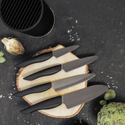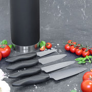 Kyocera präsentiert einen Messerblock, der anders ist als andere. Sein Design fällt durch die elegante runde Form in edlem Schwarz auf und wird so zum Stilmerkmal in der Küche. Schön auch das hochwertige Band aus Edelstahl, auf dem das Kyocera-Logo eingraviert ist! Das Qualitätsprodukt von Kyocera ist bereits mit vier Keramikmessern der SHIN Serie, schwarze Keramik-Hochleistungsklinge des renommierten Herstellers bestückt, dem Kyocera SHIN Obst- und Gemüsemesser, dem SHIN Universalmesser, dem SHIN Schälmesser, sowie dem SHIN Santokumesser. Insgesamt verfügt der Block über Messeschächte, in denen sechs bis acht Messer sicher platziert werden können. Das kleine Messer in diesem hochwertigen -Set ist mit seiner 11 Zentimeter langen Keramikklinge die erste Wahl beim Obst- und Gemüseschneiden. Das zweite Messer empfiehlt sich mit einer Klingenlänge von 14 Zentimetern als Allrounder und ganz besonders bei Fisch und Fleisch. Das Universalmesser ist für alle Schneid- und Schnippelarbeiten in der Küche geeignet und die kleine Klinge des Schälmessers ist ideal um schnell und fein Obst und Gemüse zu schälen.