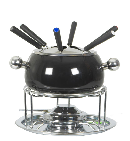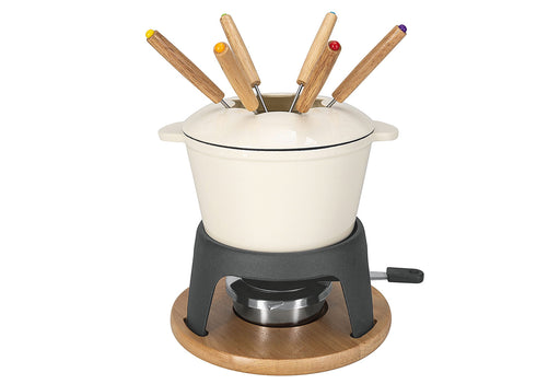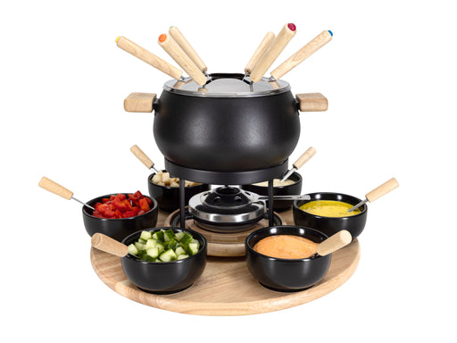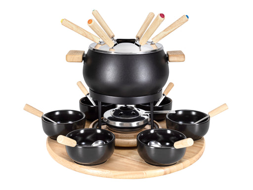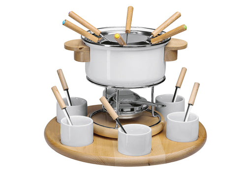 Stahl / Birkenholz / Edelstahl / Keramik, für 6 Personen, Inhalt: 1 x Fonduetopf Stahl, 1 x Spritzschutz, 6 x Fondue-Gabeln, 1 x Rechaud, 6 x Sauce...